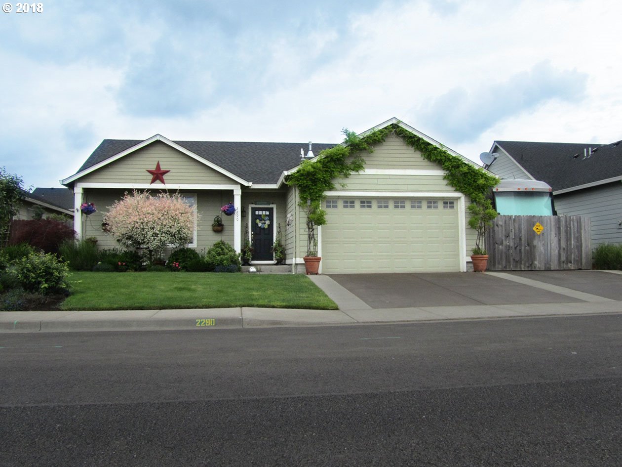 Amazing 1-level hm w/ gated RV parking! Vaulted w/ 9-ft ceiling, recessed lights, Brazilian-cherry hardwd flr & private master ste. Peaceful view w/ no neighbors across the street. Living rm w/ gas fireplace. Open dining rm w/ slider. Kitchen w/ pantry & eating bar. Large cov-patio, raised garden beds, shed & privacy shrubs in fenced yard. Detached finished shop. In the beautiful community of The Reserve, a 20-min drive to Eugene.