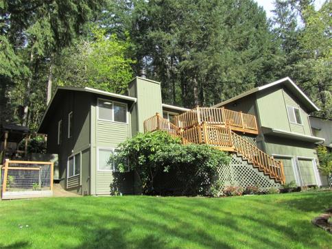 Trees and Tranquility! Vaulted ceiling, granite counters, recessed lighting, skylights, good separation of space, built-in hot tub and 3 decks! Living room with fireplace opens to dining area. Kitchen with garden window and eating bar opens to family room with door to deck. Master suite is on its own level with walk-in closet, bath with 2 sinks plus access to deck. Wonderful view of the trees, wood storage, garden, yard and tool shed with access to garage.